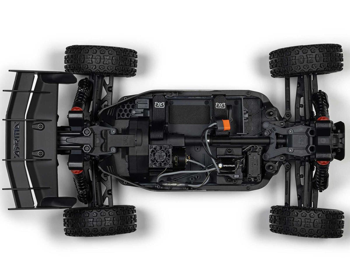 The durable chassis is ventilated to keep onboard components cool. Larger side guards provide maximum protection from dirt and debris. Adjustable, suspension and oil-filled, coil-over shocks help soak up rough terrain. Large shock shaft guards on the front of the buggy ensure your shock shaft stays protected during extreme bash sessions.