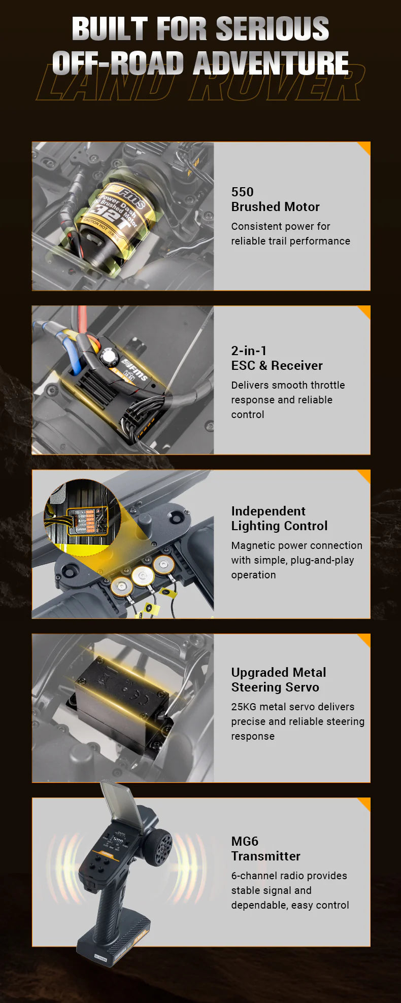Each model is packed with scale-accurate details, including side mirrors, snorkels, working spotlights, and a fully detailed interior. The durable PC soft plastic body comes with pre-installed headlights, reverse lights, and mudguards, ensuring both realism and rugged protection.