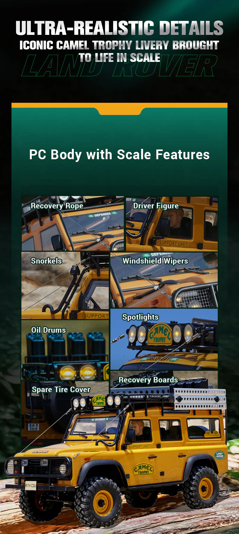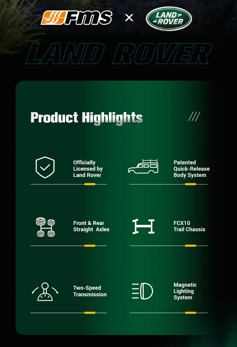 Ready for adventure, the FMS Land Rover Camel Trophy Series combines authentic design with practical trail performance, capturing the legendary spirit of Land Rover in every drive.