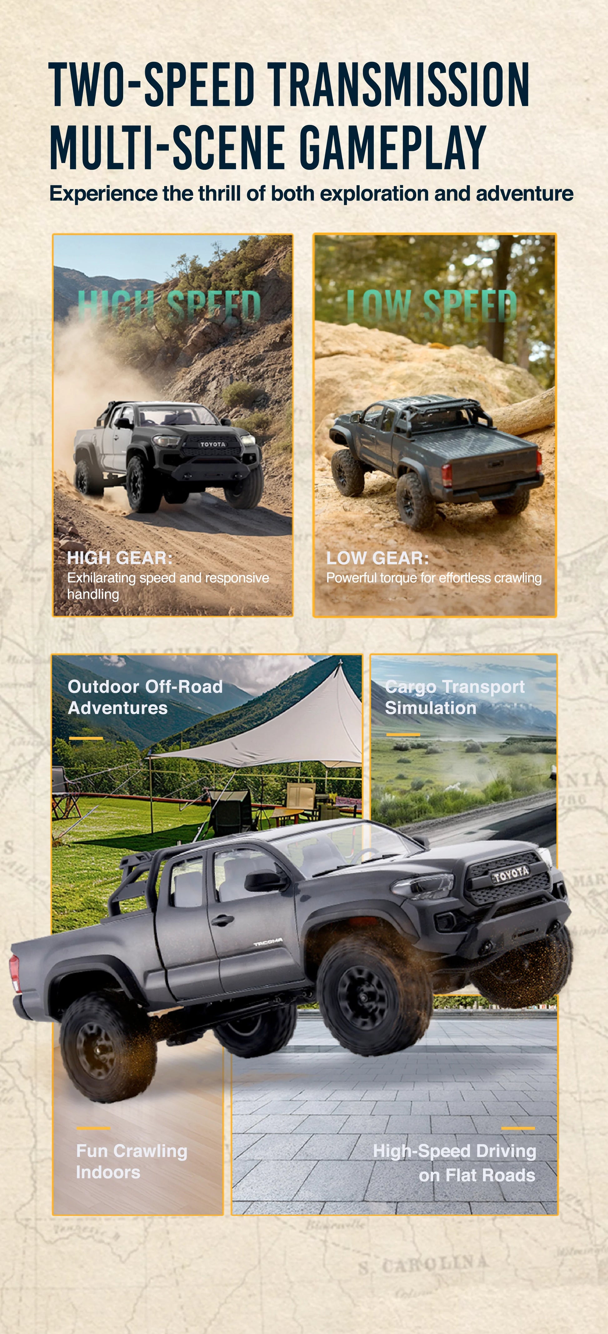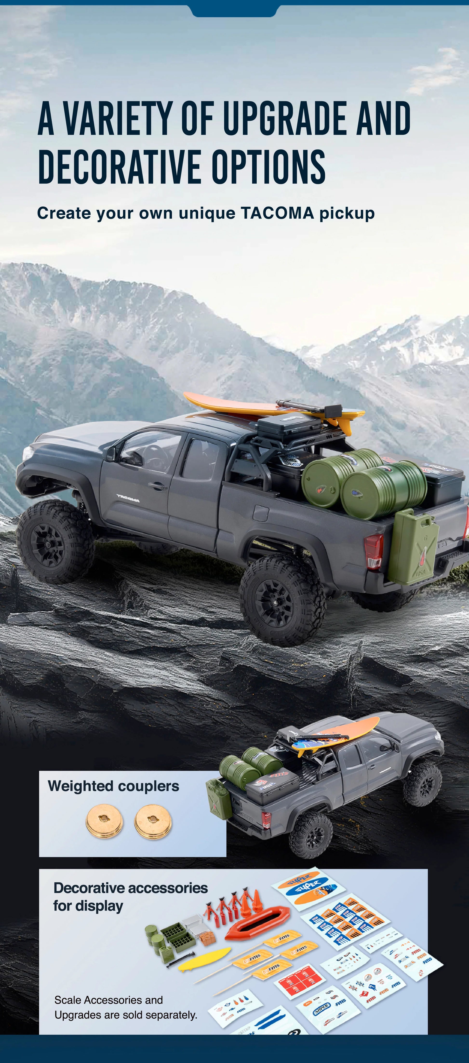Built on the next-generation FCX24M chassis, the Tacoma features a 153mm (6.02") extended wheelbase, ladder-frame construction, and solid axles for increased durability and torque control. The all-new off-road tires deliver excellent grip and ground clearance, giving this micro-crawler big-truck performance.